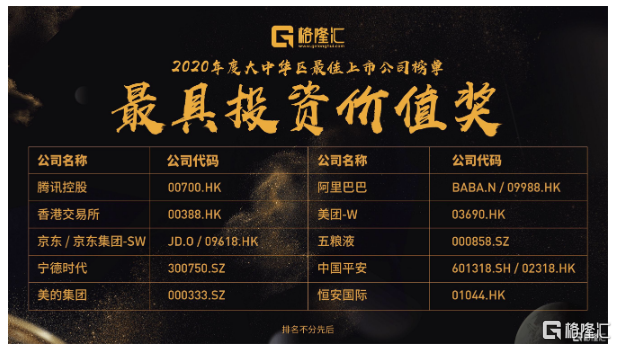 本次评选活动,覆盖了香港交易所、上海交易所、深圳交易所以及在在美上市的全部中国上市公司,各奖项均采用网络投票、定量数据分析和专家评审相结合的方式综合加权选出。从价值、成长、创新、社会责任、品牌影响力等维度作为参考指标,以“专家评审团审议+大数据分析”作为评选基准,选出了多家最具代表性的优秀上市公司。