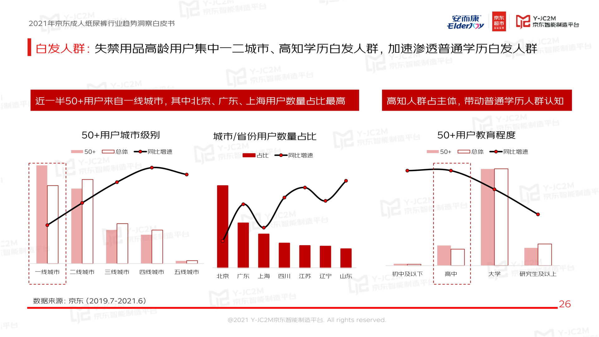 《白皮书》显示,从京东线上失禁用品用户规模来看,消费主力军占比最高的是30-34年龄段人群,同时,40-50岁+的用户群体亦不容小觑,其占比仅次于第一并且有较高增长率。不仅如此,在老龄化浪潮与国民健康意识不断增强的双重作用下,白发人群的消费力高速提升。尤其是随着网络消费渠道在乡镇消费市场的不断下沉,集中于一、二线城市、高知学历白发人群的失禁用品高龄用户群体,正加速向普通学历白发人群渗透。